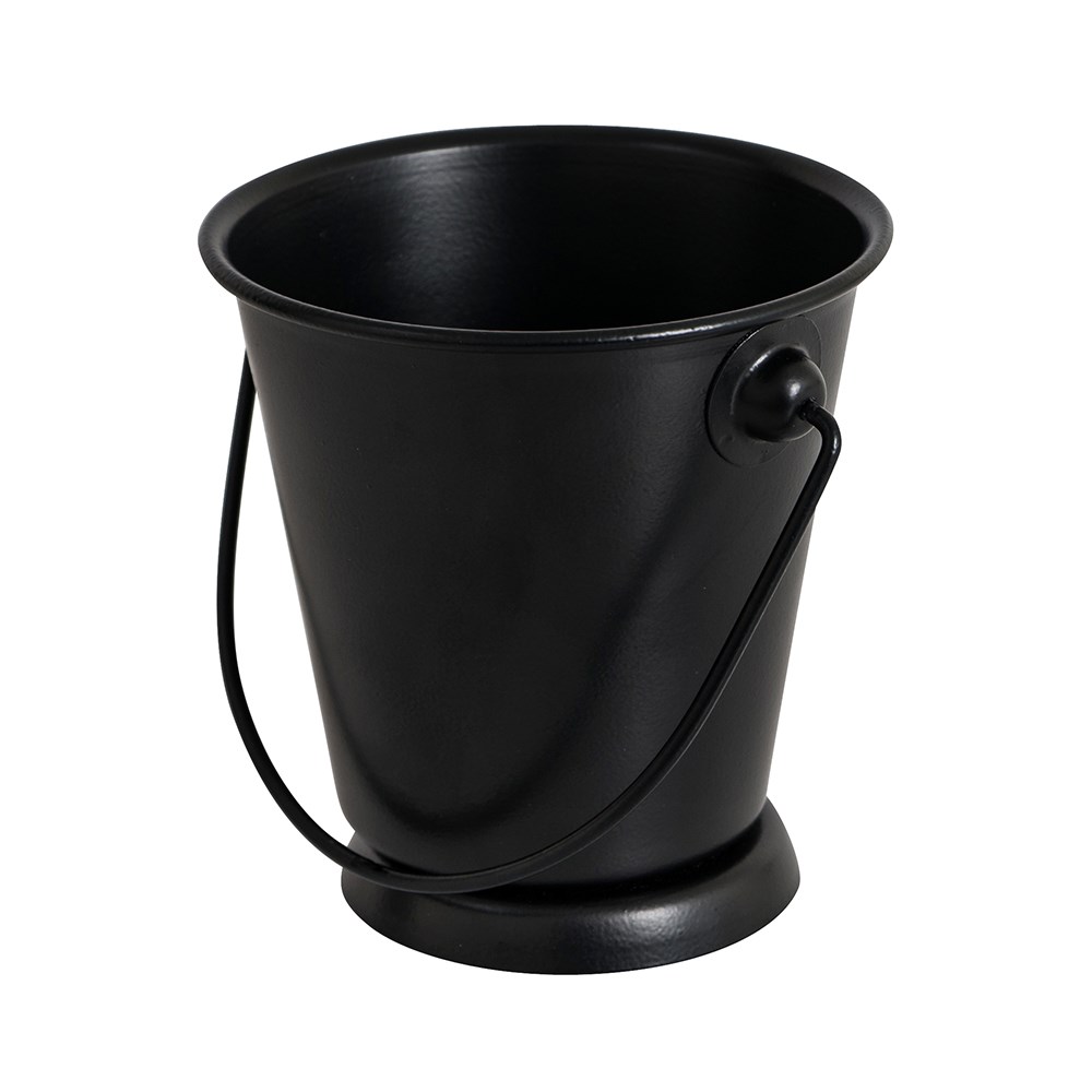 Use this black Mini Serving Pail with handle to serve your food in a fun and creative way! From seasoned french fries to specialty side orders, the sleek, silver form promotes an eye-catching display. As guests enjoy their meal, staff can rest assured the durable stainless steel construction will hold up to heavy, commercial use. This pail provides a creative alternative to traditional bowls, plates, or platters. It features a rustic handle designed to both make transporting easier and bring old-fashioned charm to your tabletop. Enhance food presentation at your cafe, restaurant, or outdoor eatery with this stainless steel serving pail.