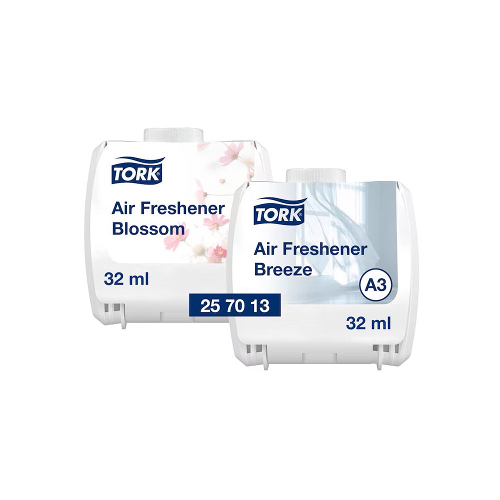 Refresh the bathroom or any space with the Air Care Air Fresheners 32ml from Tork. Available in 3 scents and one variant lets you buy 2 different scents. The Blossom scent leaves a pleasant balance of delicate floral notes. The Neutral scent offers a high concentration of odour eliminator with a hint of lemongrass, perfect for neutralising foul smells in bathrooms. The Breeze scent keeps the washroom feeling fresh with an intense fragrance featuring floral, ylang-ylang, and woody notes.