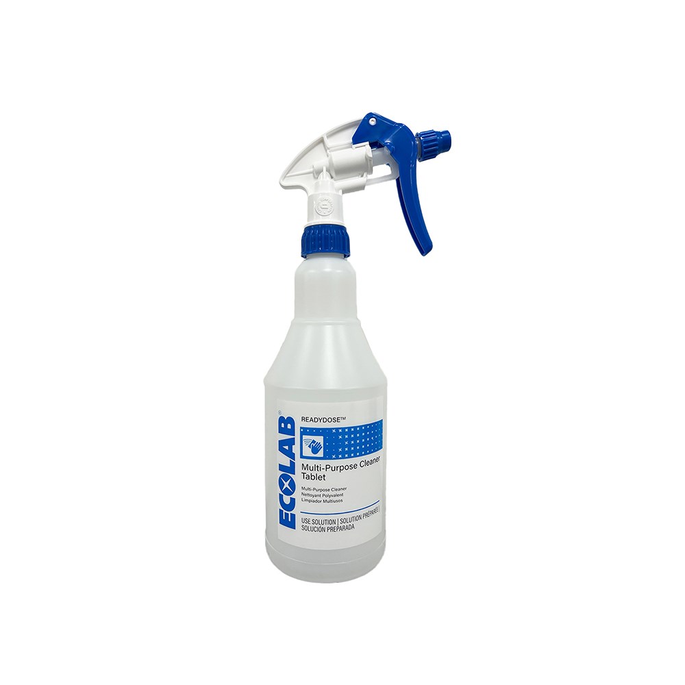 This ReadyDose Multi-Purpose Plastic Spray Bottle by Ecolab is an efficient cleaning solution designed for food service, janitorial, and housekeeping applications. Suitable for use with ReadyDose Multi-Purpose Cleaning Tablets that deliver exceptional cleaning performance with minimal effort. Simply dissolve one tablet in water to create a high-performance multi-purpose cleaner that effectively tackles dirt, grease, and grime on multiple surfaces.