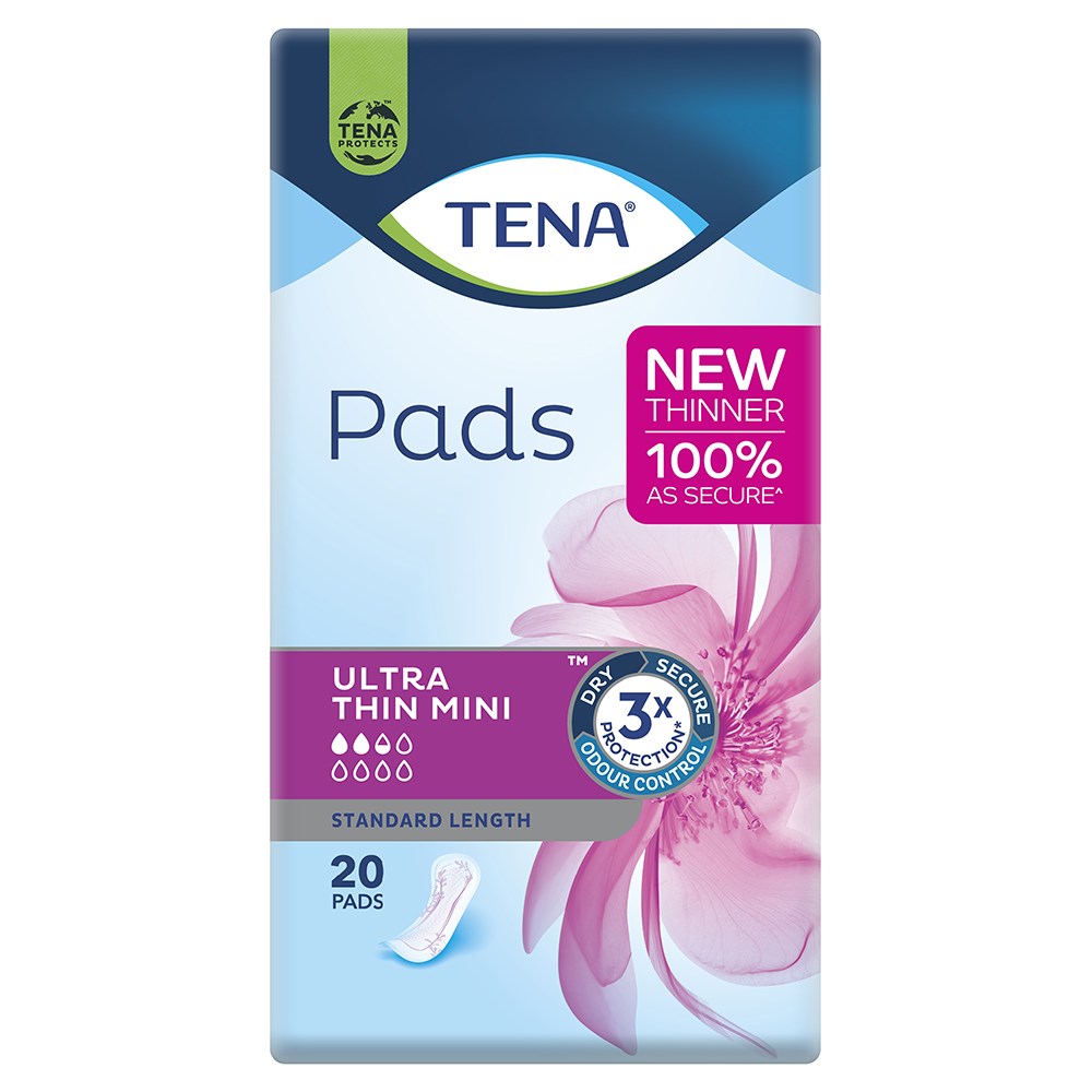 TENA Mini Pads a longer than liners but smaller than incontinence pads. These personal hygiene products are suitable for managing moderate leak incontinence associated to bladder weakness, laughing, coughing, sneezing pregnancy, menopause, or other associated medical instances. This product reatures TENA Tripe Protectin against leaks, odour and moisture to keep you fresh through the day as well an asymmetrical shop offering a 3D fit for greater comfort and security.