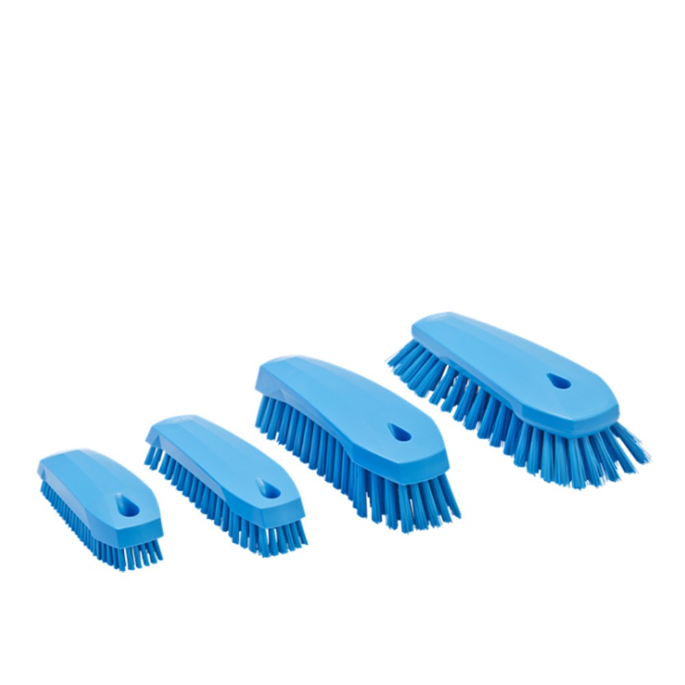 Use the Vikan Hand Scrub Brush with Stiff Bristles in blue to effectively clean tables, conveyor belts, chopping boards, buckets, large bowls, and equipment with hard-to-reach corners and crevices. Its stiff bristles provide aggressive scrubbing for stuck-on debris without damaging delicate surfaces. It has denser bristles that can cover more area and has good length to reach crevices and contours effectively. Its compact size is perfect for detailed work and cleaning stuck stains.