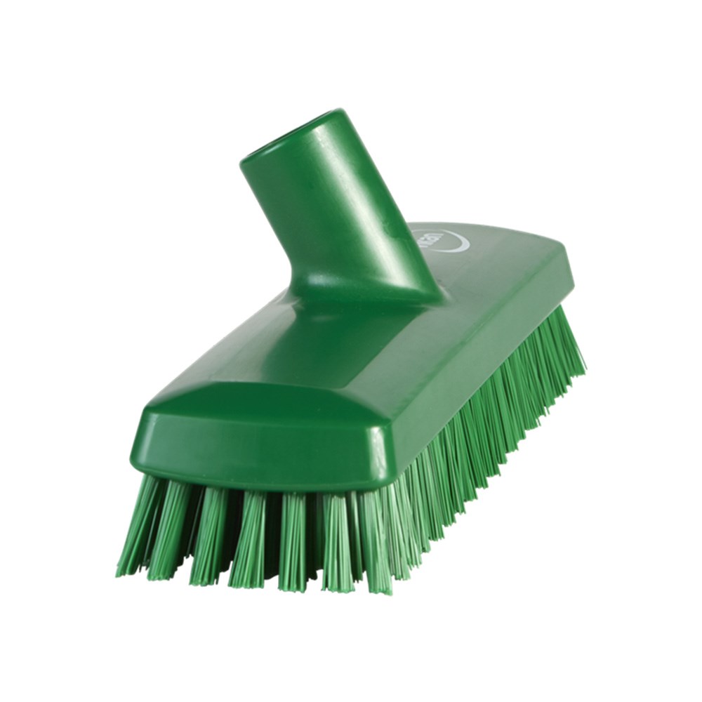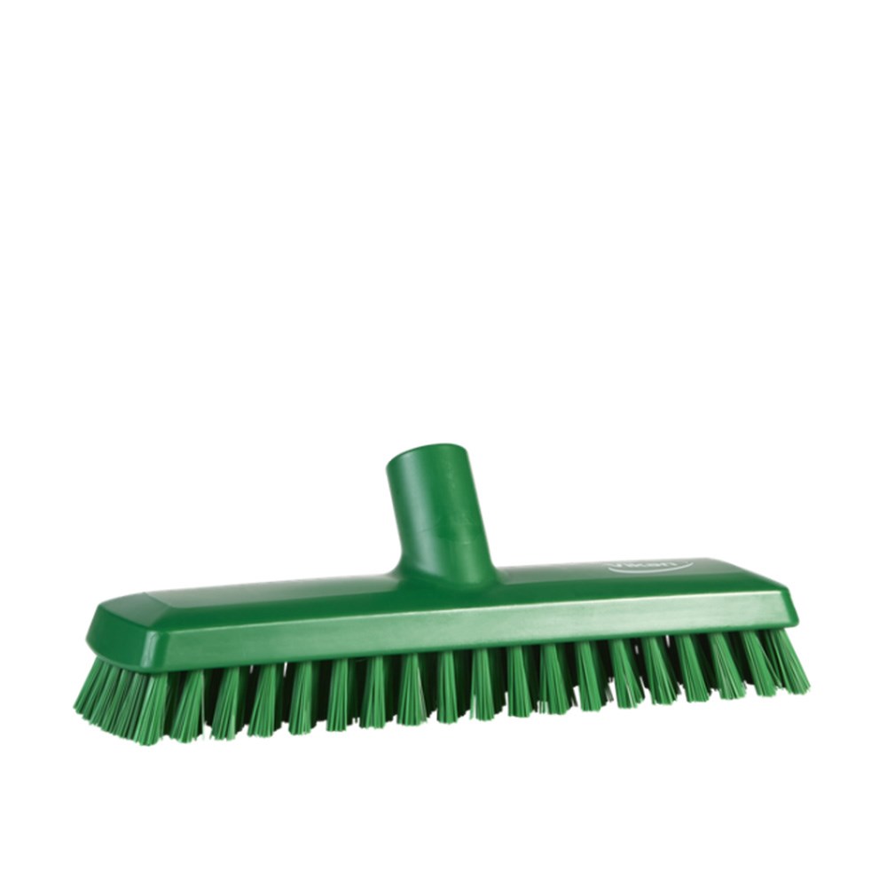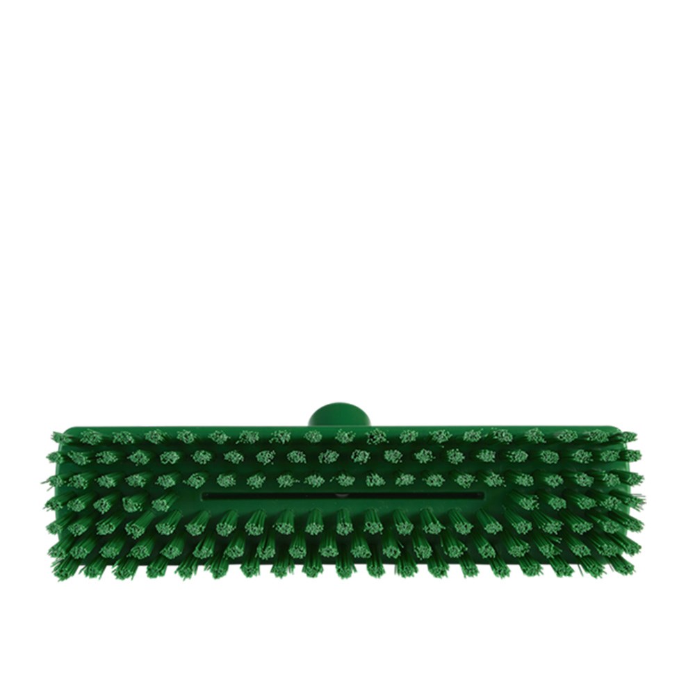 Easily clean heavily soiled areas such as abattoirs and meat processing plants with Vikan Waterfed Deck Scrub with Stiff Bristles 270mm in green, featuring highly effective water distribution. Its stiff and durable polypropylene bristles resist deformation but can remove dislodged grimes without damaging sensitive surfaces.