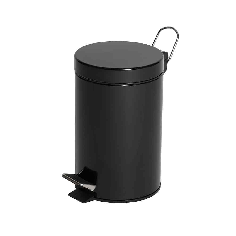 Powder coated steel pedal bin with carry handle and sturdy foot pedal for hands-free waste disposal. Compact size ideal for bathroom, desk, accommodation or living spaces.