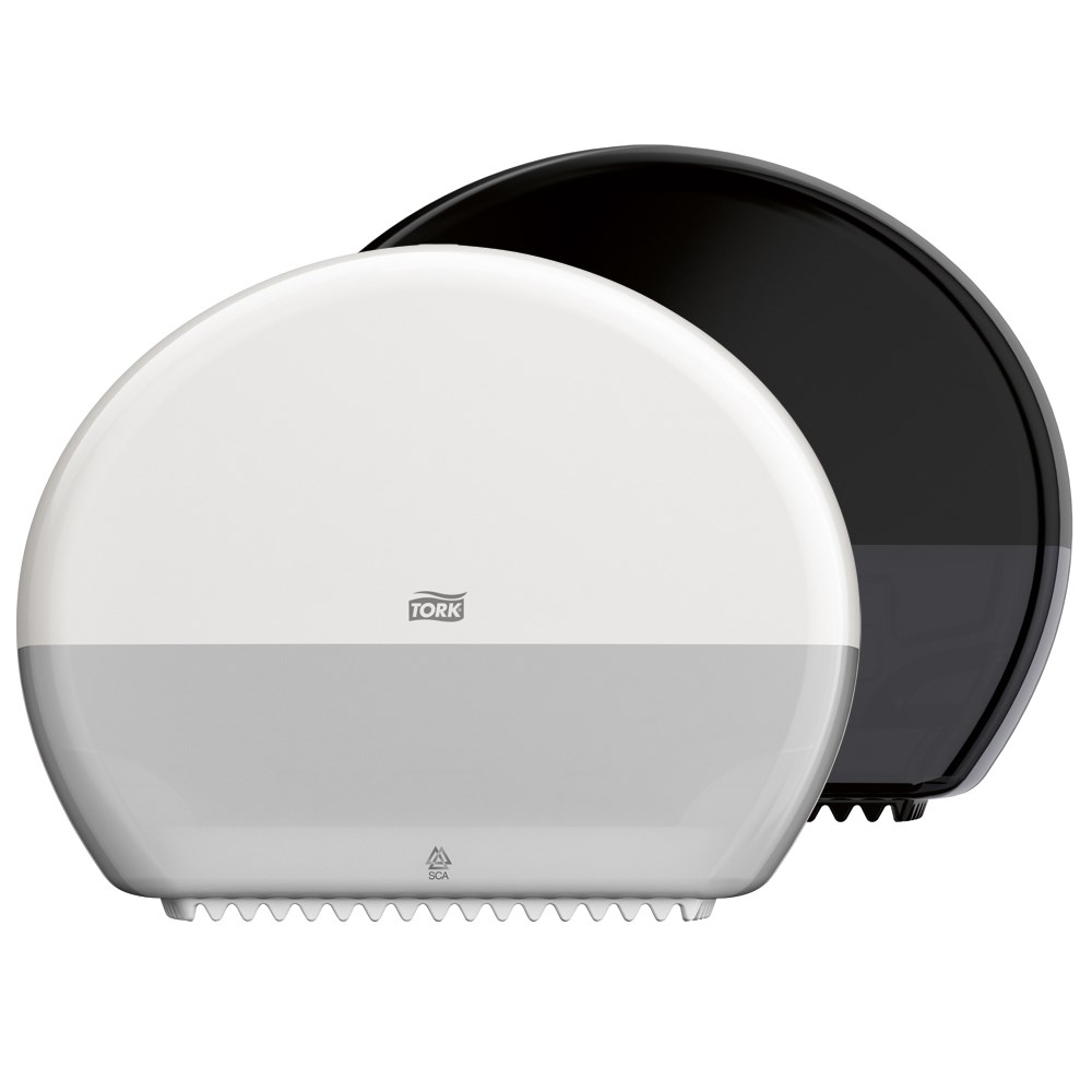 The Tork Mini Jumbo Toilet Roll Dispenser in Elevation Design is ideal for medium to high-traffic washrooms where time efficiency and reduced cost are important. The high capacity saves maintenance time and ensures that paper is always available. The Tork Elevation dispensers have a seamless, functional, modern design, that makes a lasting impression on your guests.