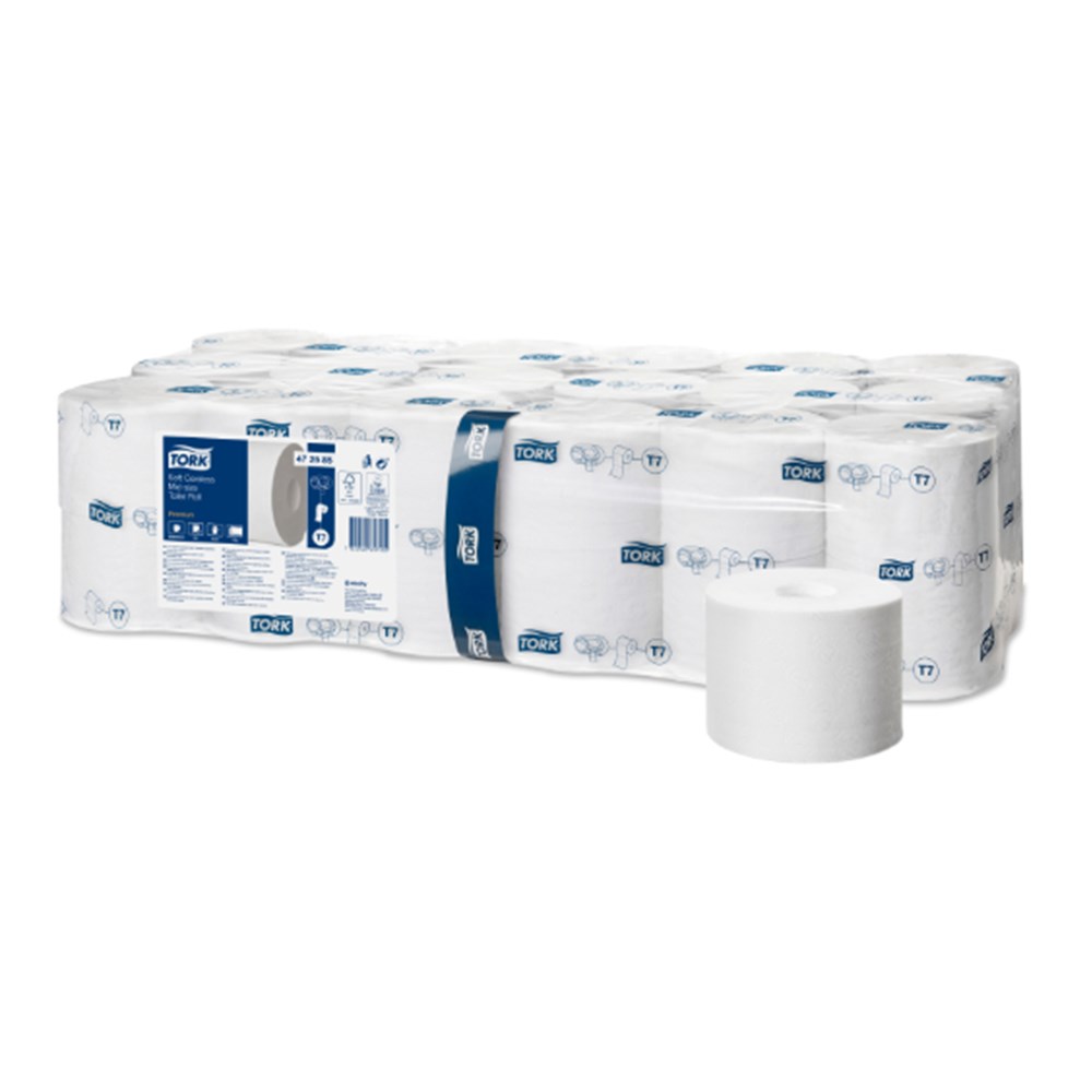 The Tork Twin Coreless Mid-size Toilet Roll Dispenser system is ideal for low to medium traffic washrooms with high focus on guest satisfaction. It ensures high efficiency and that toilet paper is always available for guests by holding two full mid-size rolls. The Premium Tork Soft Coreless Mid-size Toilet Roll offers a superior look and feel with the right performance.