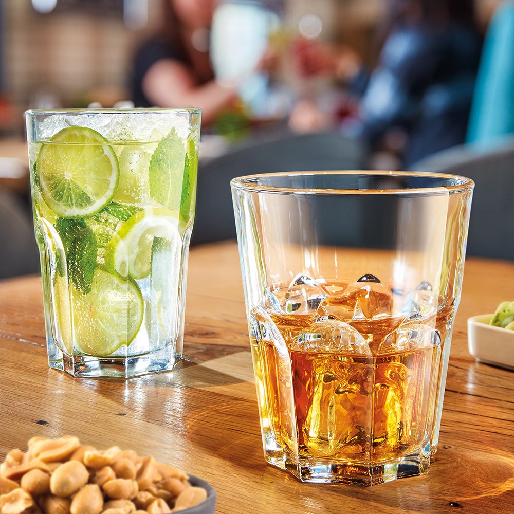 The Granity range is available in Old Fashioned glasses suitable for smaller measured softdrinks, spirits or juices. It's also available in Highball glass, a tumbler, for larger measures of softdrinks, cocktails or water. The versatility of these glasses is vast making them a staple in many establishments.