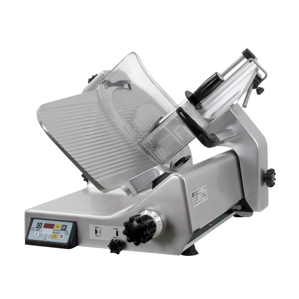 The Manconi semi-automatic gravity-feed meat slicer has been designed for heavy-duty applications. Anodised aluminium and stainless steel construction make it rugged, with a large receiving plate, three selectable stroke speeds and stroke lengths, precision slicing action and a full suite of safety features making this one of the most functional and versatile semi-auto meat slicers on the market.