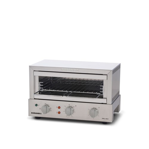 The Roband Grill Max Toaster is manufactured in Australia with Dura-life stainless steel elements, good heat retention meaning heat remains after elements turned off to keep food warm, brushed stainless steel body, energy regulator, 5 minute timer with bell, easy-clean removable crumb tray and reflector, top and bottom or top only heat selection and multiple rack positions. Max toasting height 79mm.