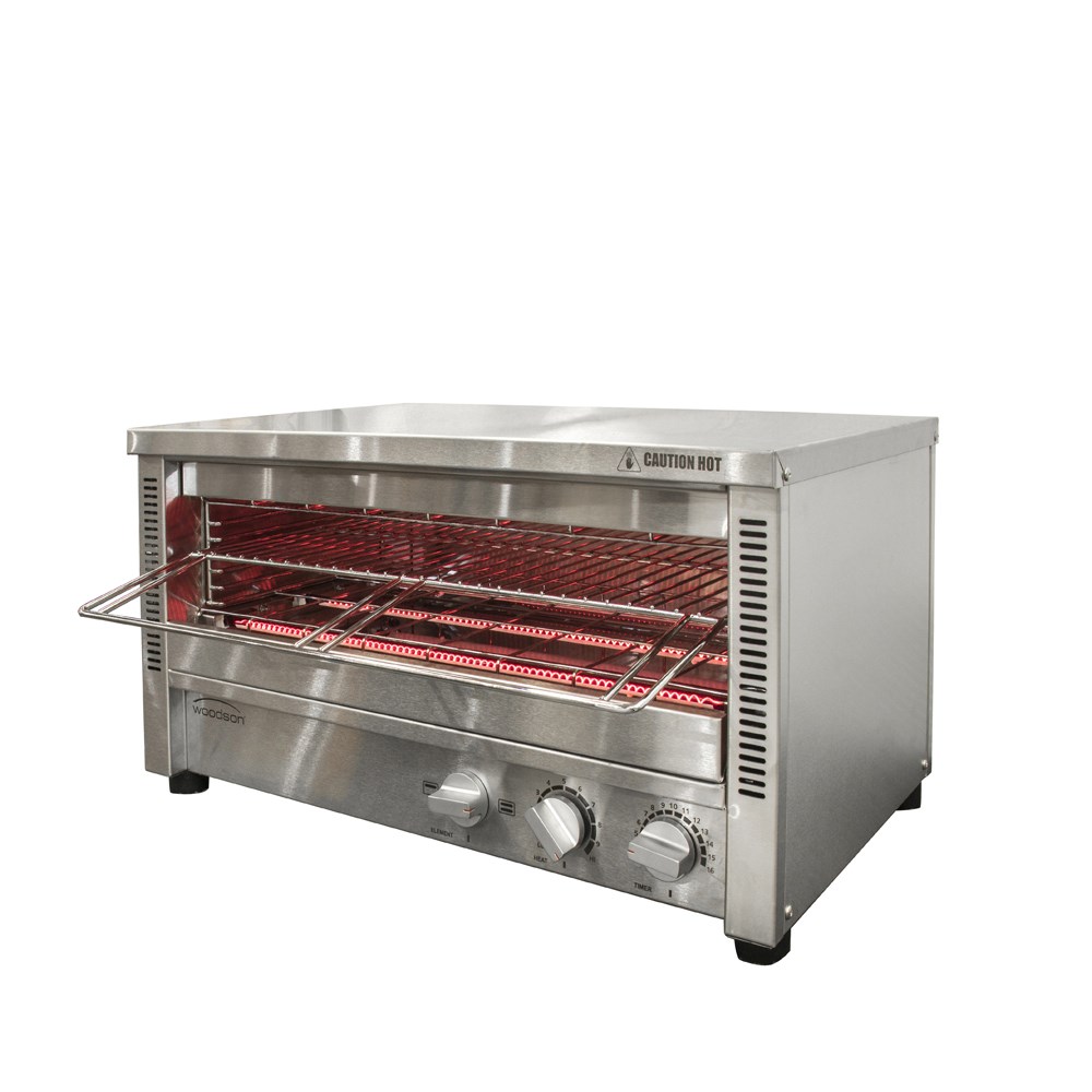 With a fifteen slice capacity, the Woodson Glass Element Salamander is the perfect size for a busy, quick service kitchen. The 'instant' heat infrared glass top elements delivers energy efficiency, while providing strength and durability. Two operation modes, timer controlled and manual control with rack activated switch, offers users a quick and easy to use system. This unit is easy to maintain, safe to use and extremely reliable.