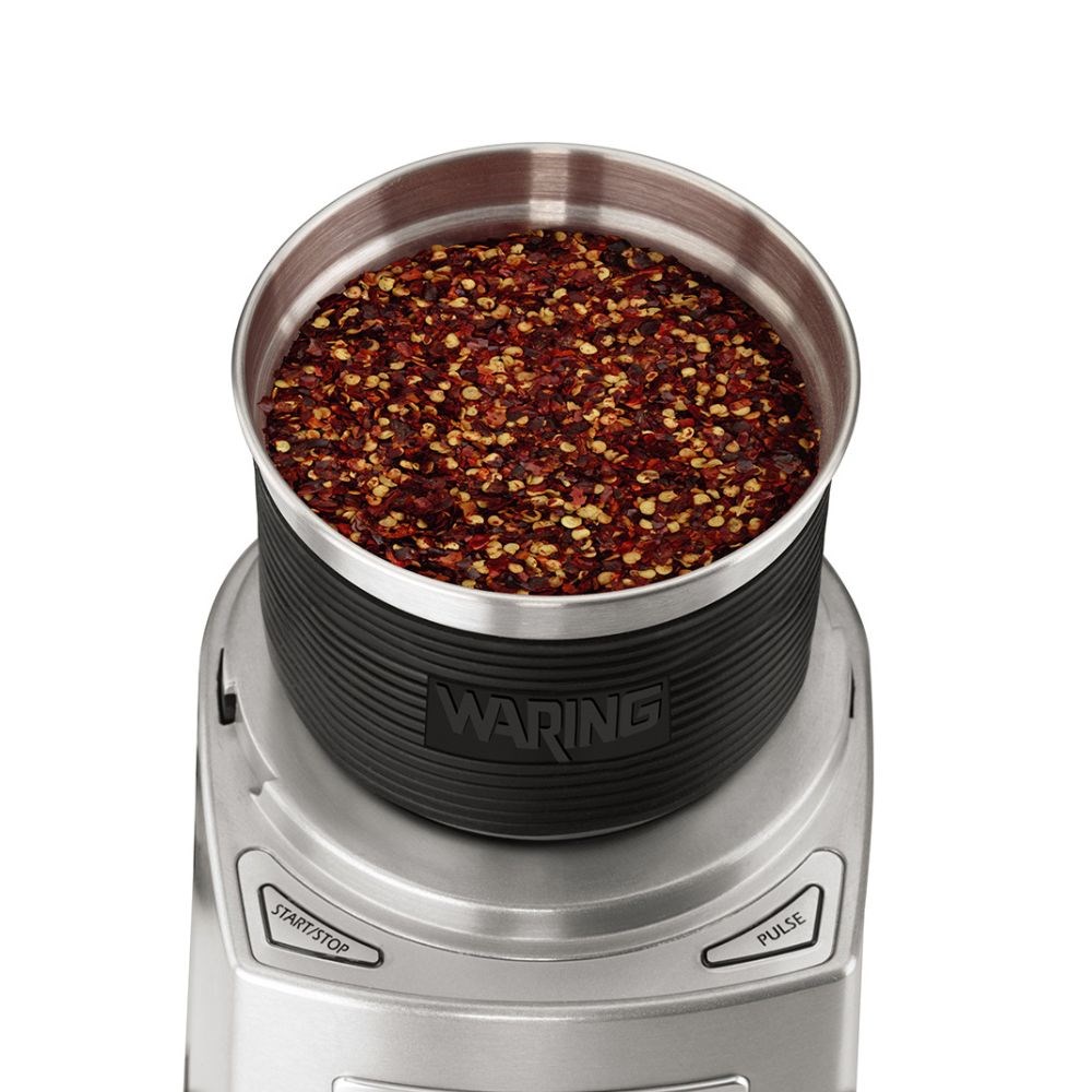 Grind tough spices or process pastes effortlessly with the powerful Waring spice grinder. Featuring two operational modes — simple pulse or continuous pulse. The 710 ml capacity Waring® WSG60 Wet/Dry Power Grinder is perfect for peppercorns, cinnamon, nuts, garlic, herbs, and other dry and wet blends. Includes two fully removable and dishwasher-safe, stainless steel grinding bowls with convenient storage lids. Sealed clear-view operating lid allows for liquid processing up to 350 ml to make pastes, dressings, sauces, creams and more.