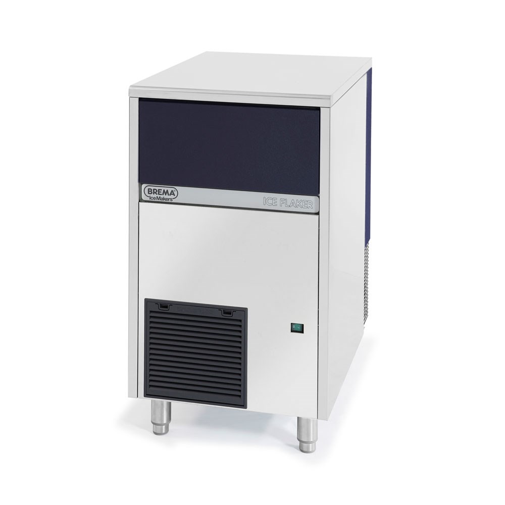 Brema Granular Ice Flaker with Internal Storage Bin offers 95Kg of ice production per 24 hours and 30Kg storage capacity. Includes external water filter. Self contained ice maker with outstanding reliability and quality backed by a 3 year warranty. Cutting edge Italian design and manufacturing. Tropical class +43 degrees celcius rated. Efficient water to ice ratio - 1 litre of water makes 1 kg of ice. Great for exhibiting and presenting foods as well as for use in medical industries. The ice has a fast and efficient refrigerating effect and is easy to handle and dose.