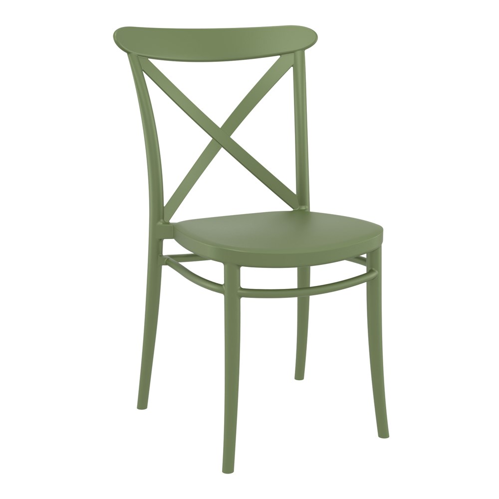 Cross stacking chair is produced with a single injection of polypropylene reinforced with glass fibre obtained by means of the latest generation of air moulding technology with neutral tones. For indoor and outdoor use.