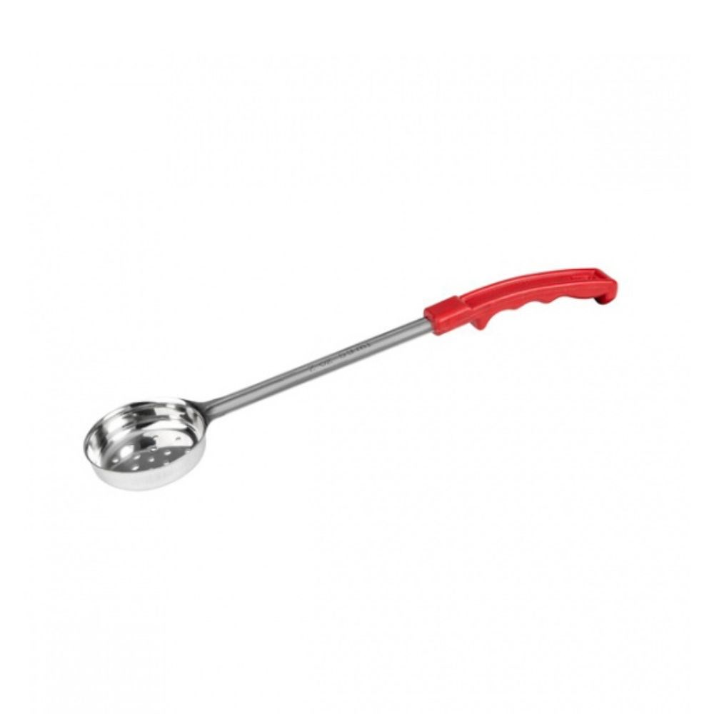 Featuring a red handle for easy identification, this spoodle is built for comfort and daily use in busy kitchen environments. The ergonomic design provides a secure grip, making it easy to scoop and serve. Perfect for restaurants, cafés, and catering services, the Spoodle Stainless Steel Perforated 60ml Red Handle is a practical tool for portioning and serving a variety of dishes.