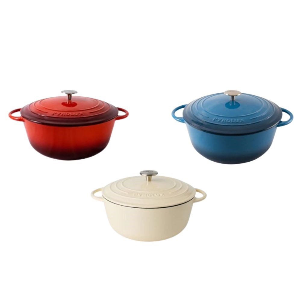 The Pyrochef French Oven Round by Pyrolux blends classic cast iron performance with modern convenience. Its even heat distribution and triple-layer enamel coating deliver reliable cooking and effortless cleaning, ideal for slow-cooked meals, soups, roasts, and bakes.