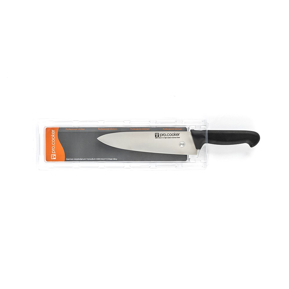 The 20cm Cooks Knife with black handle in the Julienne range of professional kitchen knives by Pro.cooker is the ultimate kitchen companion. Crafted with precision and durability in mind, these knives are designed to be your go-to solution for chopping, slicing, and dicing with effortless ease. An element that makes the Julienne range of Cooks knives a popular choice is the selection of colours available to ensure optimal food hygiene with the prevention of cross-contamination between ingredients. Available in three sizes, the 200mm range includes blue, brown, green, red, white, yellow and purple beyond this black knife.