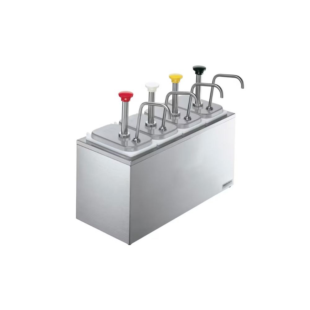 Perfect for any foodservice setting, this serving station is equipped with captured valve balls to prevent loss, ensuring the pumps remain fully functional. For a polished presentation, coloured, engraved knobs can be requested to identify contents, though black knobs are standard. This practical and stylish serving station offers an efficient and hygienic way to serve your favourite syrups and toppings with Portion Optimization™.