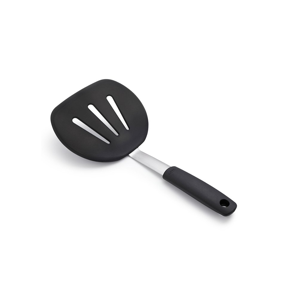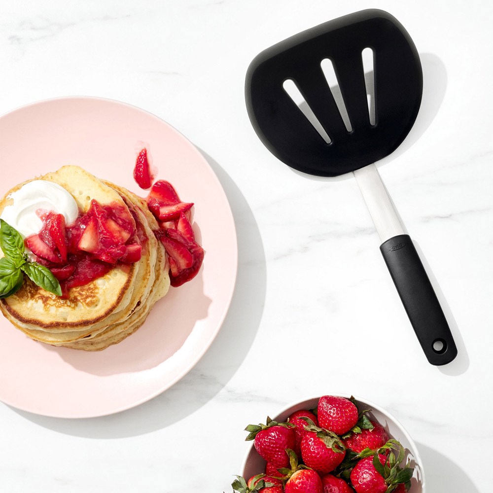 Our Silicone Flexible Turners combine the strength of stainless steel with the heat resistance and non-stick friendliness of a silicone outer layer. Thin, flexible edges glide under foods in the pan to keep them intact. The Pancake Turner easily flips pancakes, burgers and more.