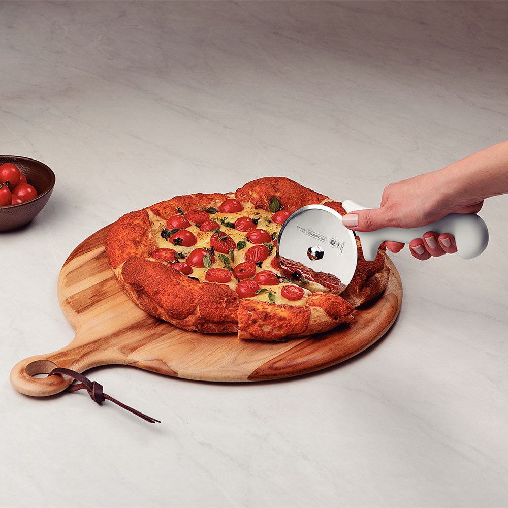 Slice through pizzas with ease and precision using the Professional Master Stainless Steel Pizza Cutter Wheel 98mm by Tramontina. Designed with chefs in mind, this high-quality cutter features a sharp, German stainless steel wheel designed to glide smoothly and ensure clean cuts every time. The ergonomic, textured handle provides a comfortable grip to reduce hand fatigue while providing excellent user control. Manufactured with antibacterial protection to help prevent the growth of harmful bacteria, this dishwasher-friendly product is easy to keep clean and resistant to stains and odours. This pizza cutter is also NCF Certified to ensure it has been tested to meet high food safety and sanitisation specifications. Durable and reliable, this tool is an essential kitchenware piece for fast-paced food establishments such as pizzerias, restaurants, and pubs.