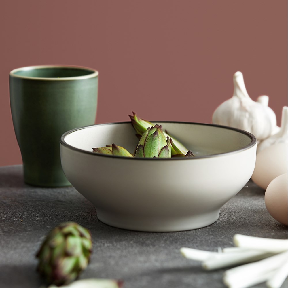 The Mod stoneware collection is available in Smokey Basil, Smokey Plum, Dusted White and Midnight. Each piece features accented banding and subtle glaze spatters resulting in stunning pieces that look great on their own or perfect to mix-and-match in dining settings.