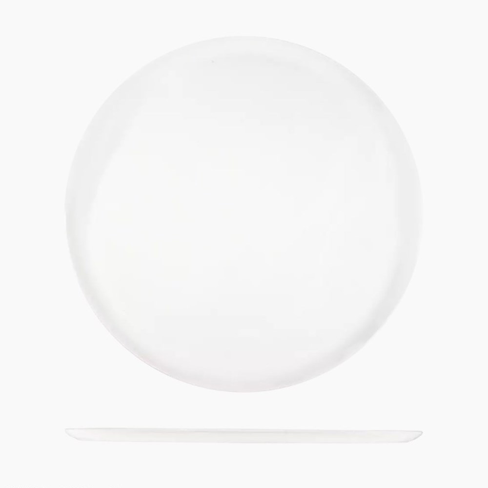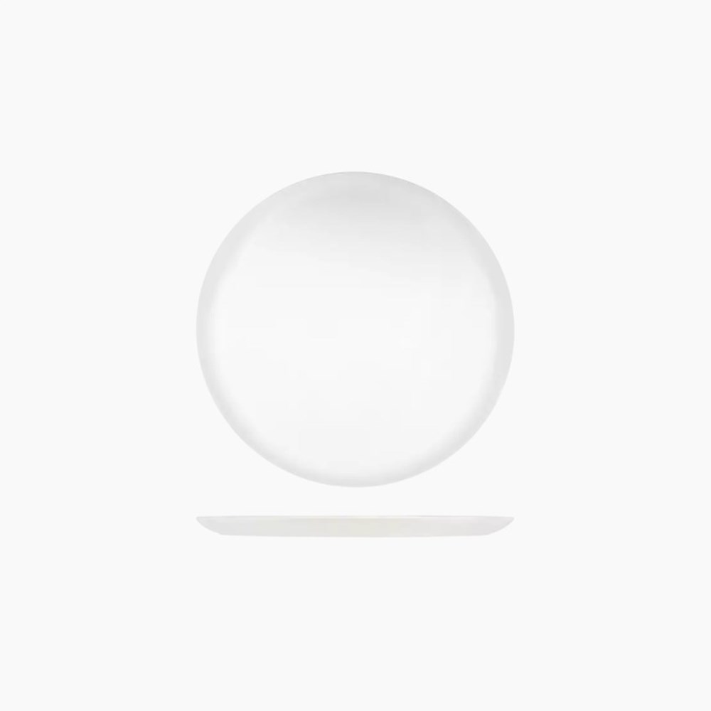 Upgrade any dining experience with the Grazia Flat Coupe Plate in white. Crafted from Alumilite (aluminated porcelain), this plate combines the durability of hard porcelain with the soft, creamy elegance of fine porcelain, adding a refined touch to every setting.