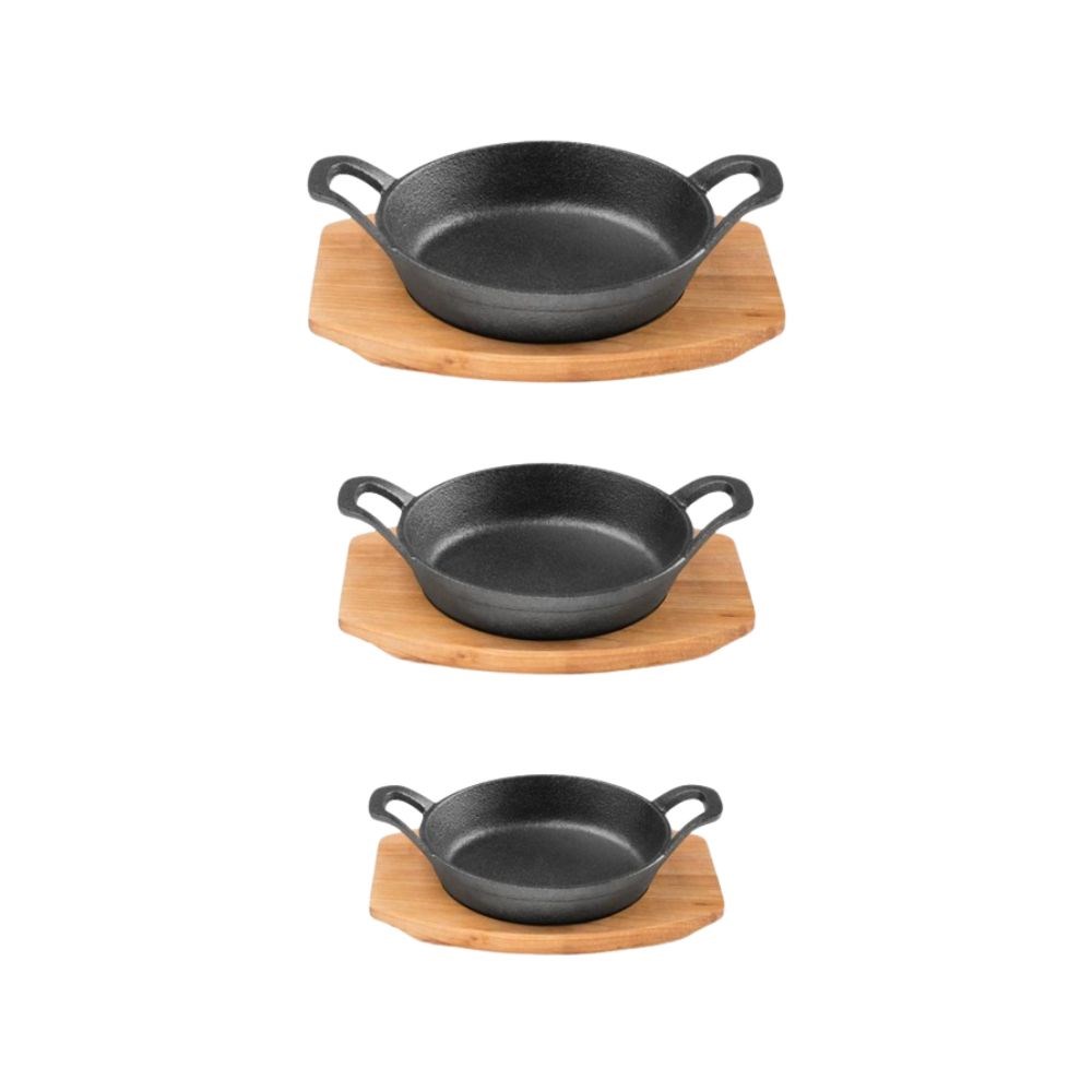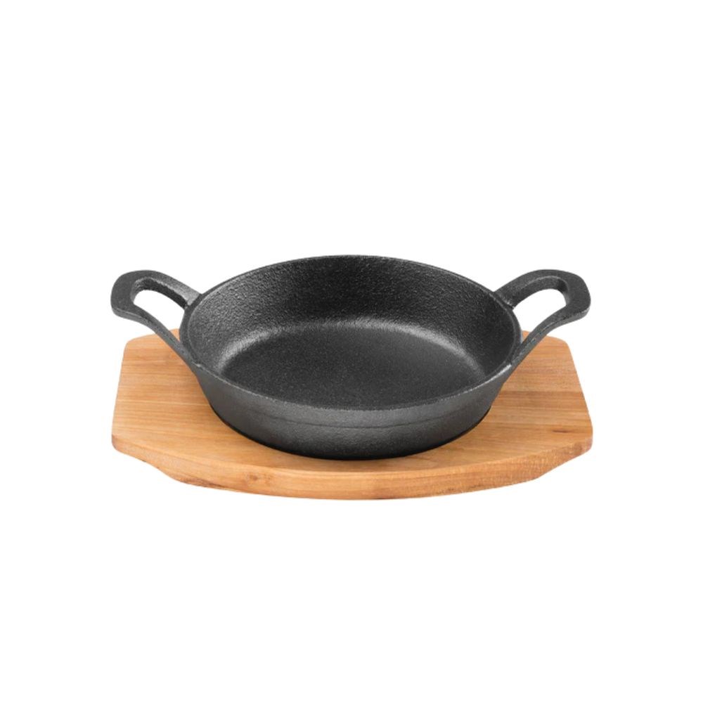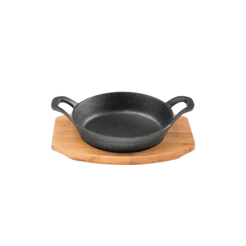 The included maple tray protects surfaces from heat while enhancing presentation. Pre-seasoned for immediate use, it resists rust and improves with every use. Suitable for all heat sources including induction and open flame. Available in 120mm, 155mm, and 180mm sizes.