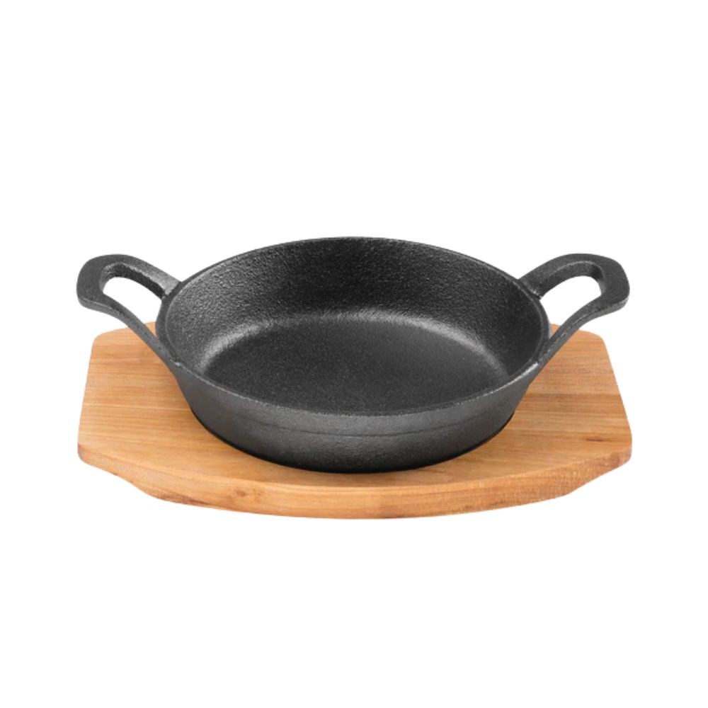 The Pyrocast Round Gratin with Maple Tray by Pyrolux offers a stylish and practical oven-to-table solution for individual portions. Made from heavy-duty cast iron, it ensures even heat distribution and reliable browning for dishes like baked pasta or desserts.