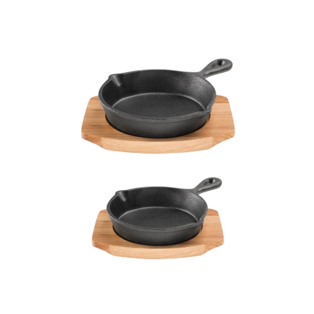 Each skillet includes a custom maple tray that shields surfaces from heat. Pre-seasoned for immediate use, the cast iron develops a natural non-stick patina over time. Available in 100mm and 135mm sizes.