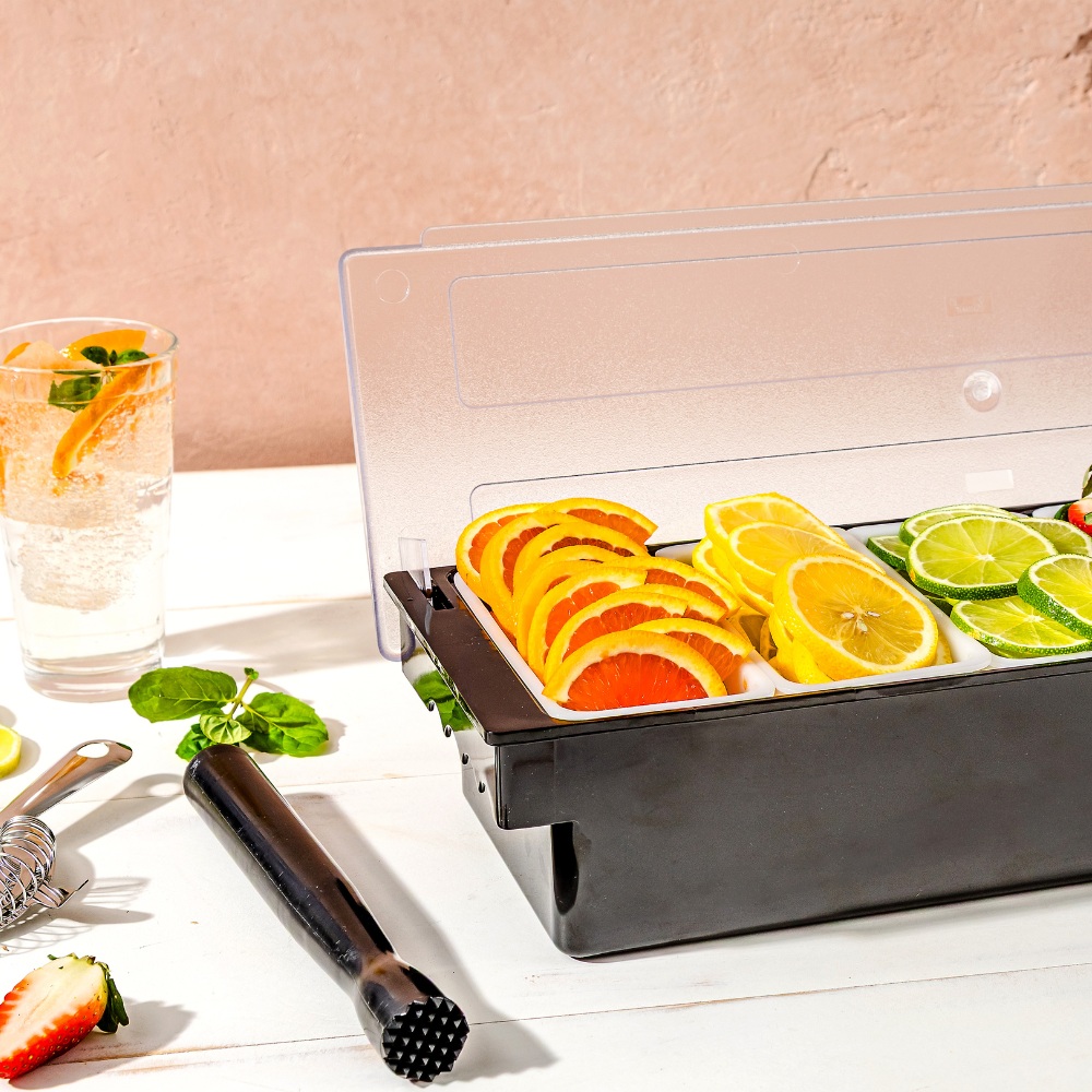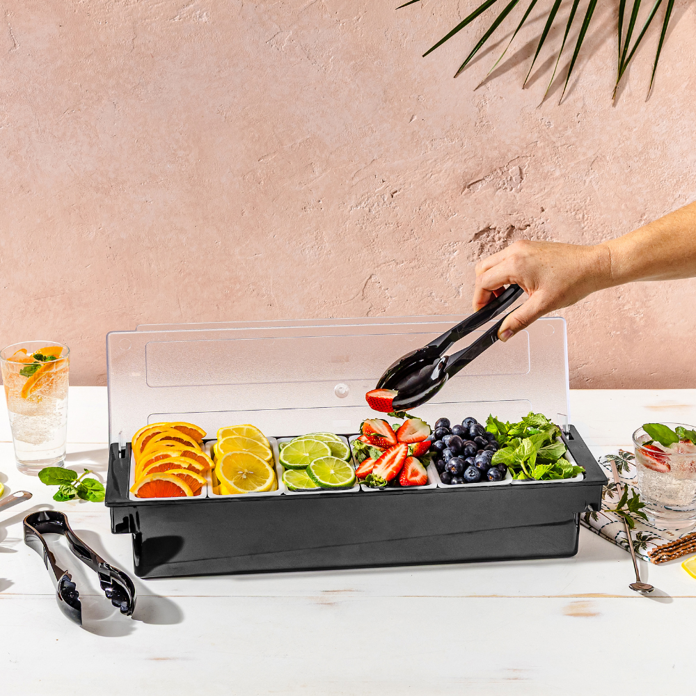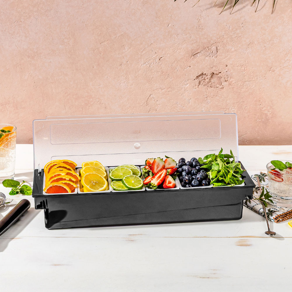 Made with a durable black plastic base, this caddy is built to withstand daily use in busy bars and restaurants. Add crushed ice under the compartments to keep contents cool and fresh throughout service. Designed for commercial settings, the Pro.mundi Barware Caddy ensures garnishes are stored conveniently and presented neatly.