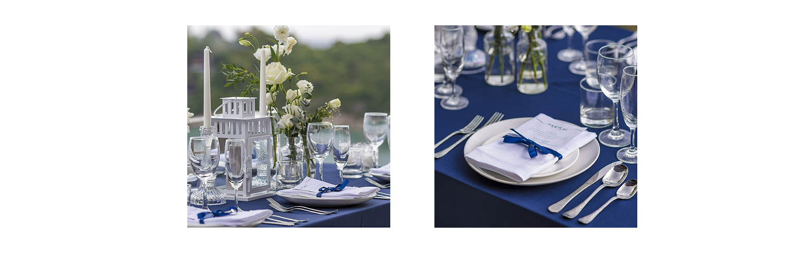 A navy and white dining setting is a crisp and elegant alternative to black and white which is often used in fine dining settings. The colour combination can be elegantly accompanied by bold silver table decorations and cutlery like the Orsay cutlery collection which is simplistic and modern in design.