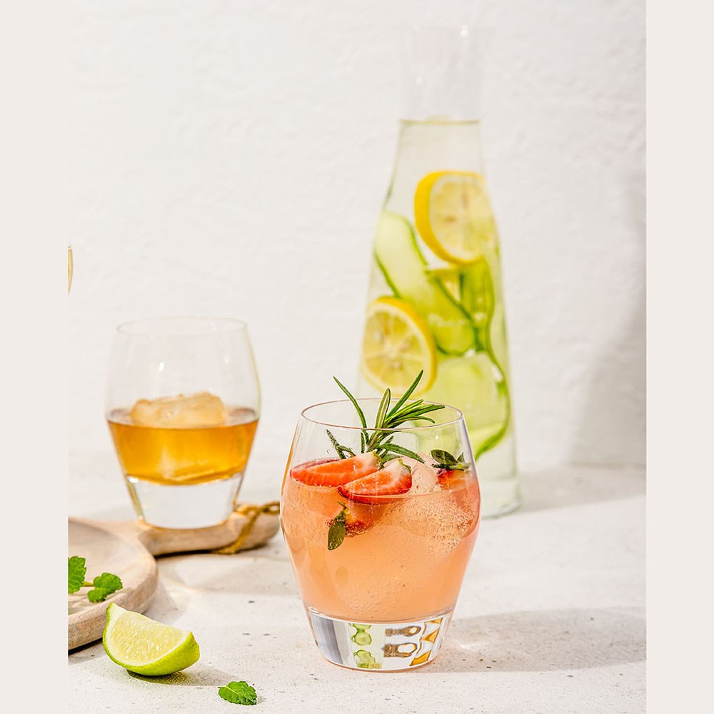 • Carafes and stemless glassware feature fine reinforced laser-cut rims