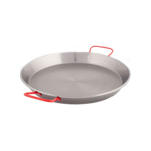 Create your next vegetarian, seafood or mixed meat masterpiece with Garcima's high quality 34mm in diameter paella pans. Designed with a round, wide, low design allows your food to cook quickly over high heat with the angled sides making your ingredients accessible for stirring. This is suitable for cooking on electric and gas cooktops, outside on an open flame or charcoal grill. Grab yourself this authentic Spanish-made pan, for a traditional cooking experience.