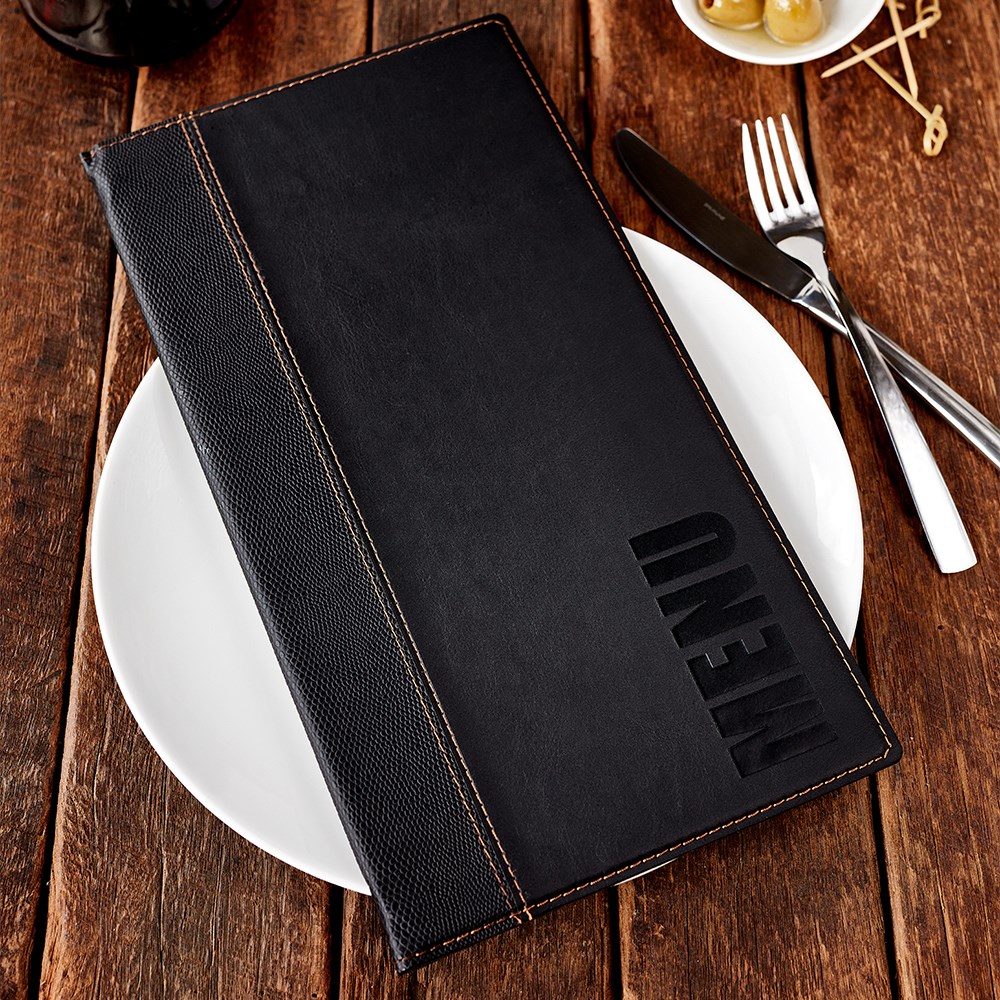 This elegant black menu holder is crafted from premium-quality synthetic leather, featuring a subtle embossed "MENU" motif that adds a sleek and professional touch to your dining experience. Designed for durability, the cover includes contrast stitching along the spine and is resistant to scratches, making it perfect for high-traffic restaurants and cafés. Its easy-to-clean surface ensures that it remains in pristine condition, even with daily use—simply wipe it down with soap and water when needed. The bonded edges provide additional durability, ensuring the menu holder stands up to the demands of busy environments. With space to hold multiple inserts, this menu holder allows you to display your food and beverage offerings in a stylish and professional manner, leaving a lasting impression on your guests.