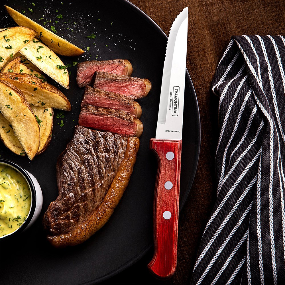 Discover the perfect blend of precision and style with the Tramontina Gaucho 127mm Steak Knife. Featuring a serrated blade crafted from German stainless steel, this knife can effortlessly slice through any cut of meat and is designed to maintain its sharpness even with heavy commercial use. The sleek polywood handle allows for a secure and comfortable grip whilst being resistant to moisture, impact and high temperatures. Its smooth red wood finish exudes rustic charm, elevating any table setting and enhancing the dining experience. Ideal for home use and commercial eateries such as restaurants and pubs, this dishwasher-safe piece adds warmth and functionality to your tabletop and is an essential addition to your cutlery collection.