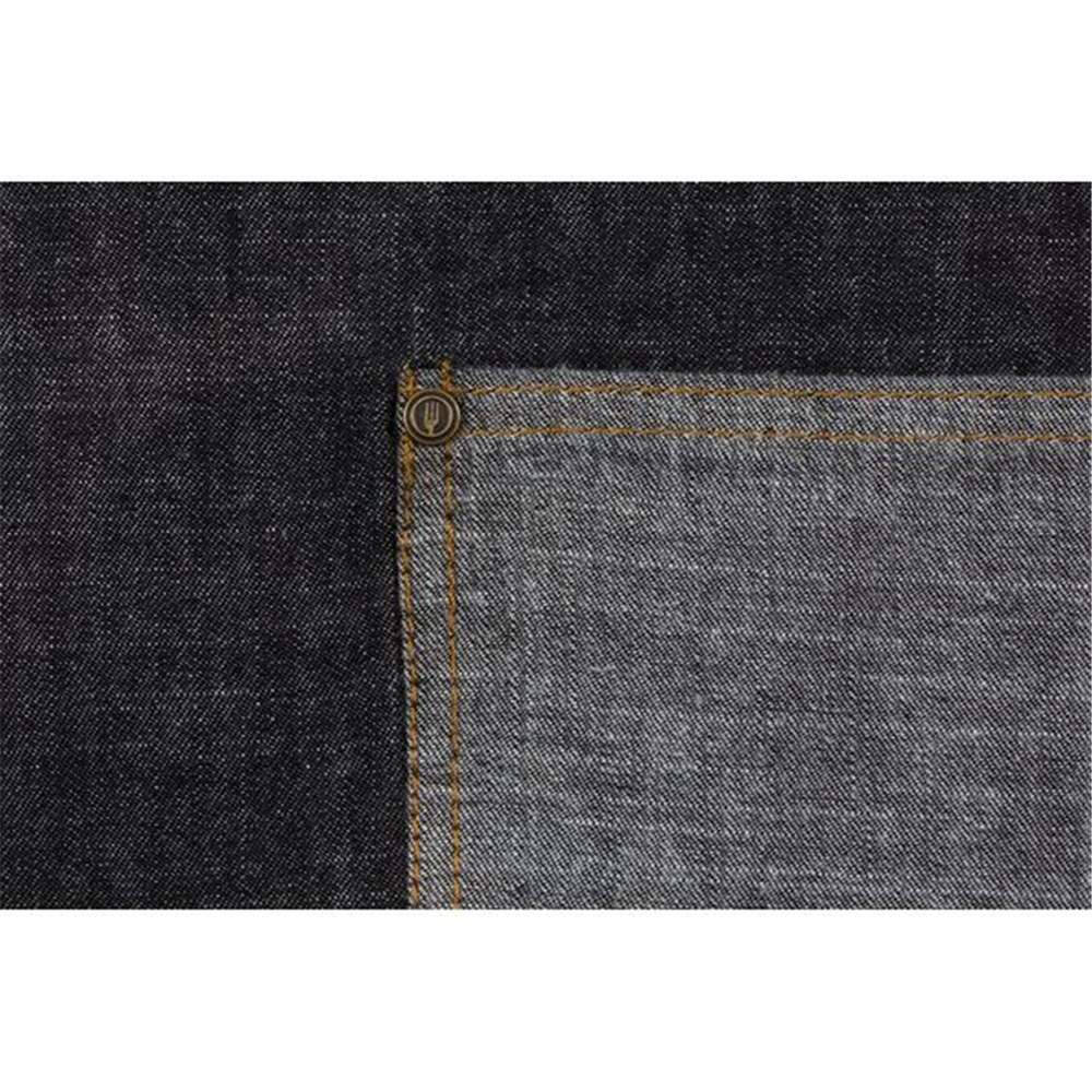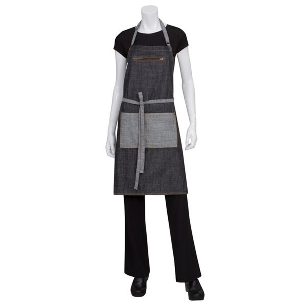 Cover up with style in this popular bib apron featuring reverse fabric pockets and ties. Availble in black or indigo, this is apron is ideal for the busiest of situations.