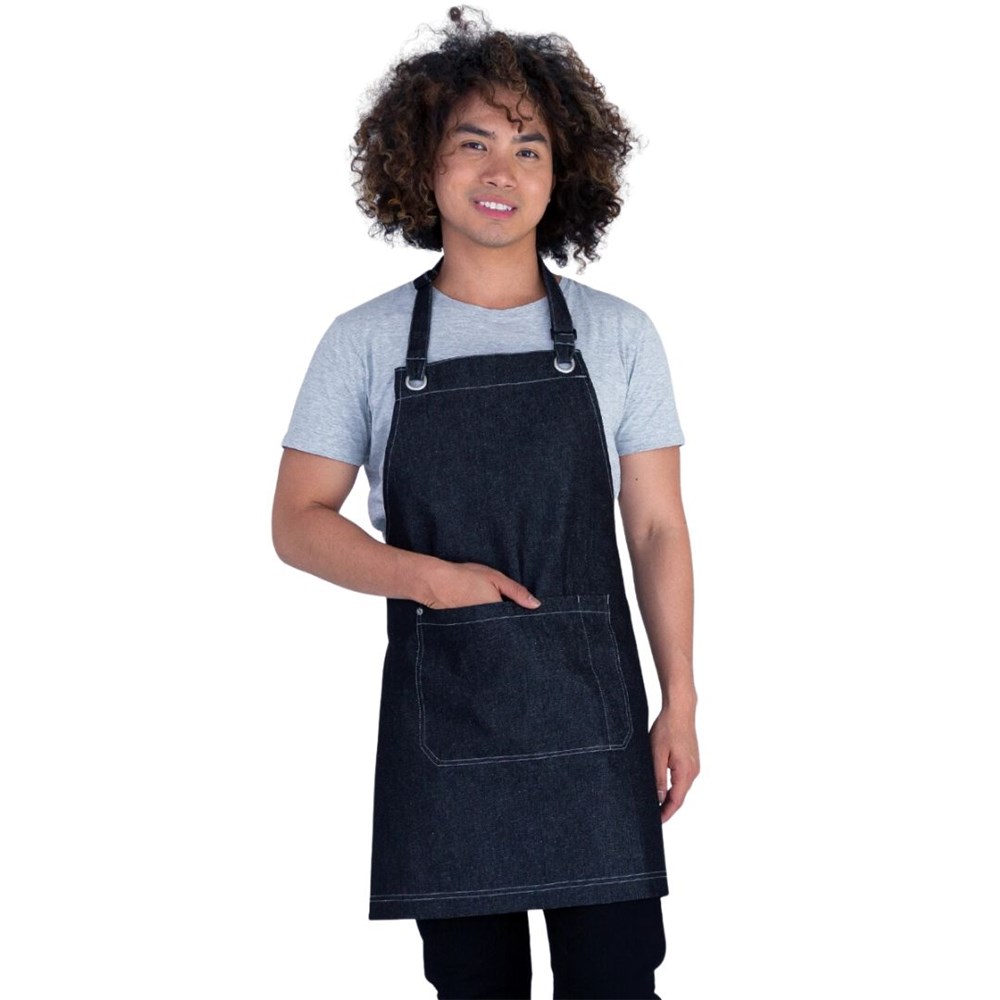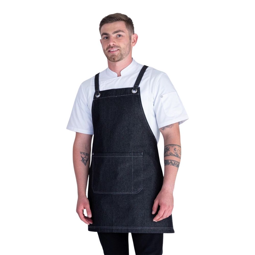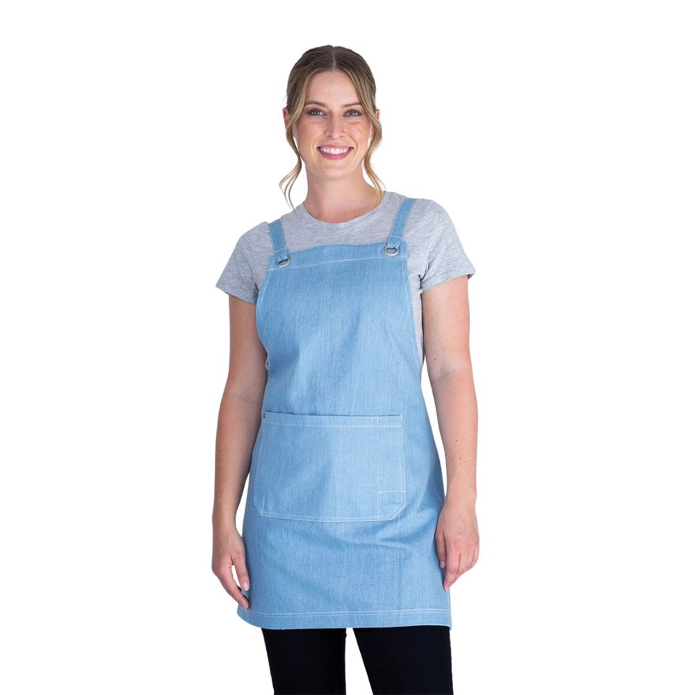 The MIA Bib Apron is a stylish and functional apron made from lightweight 100% cotton denim. Designed with cross-back straps, this shorter, above-the-knee style offers comfort and flexibility, perfect for those on the go.