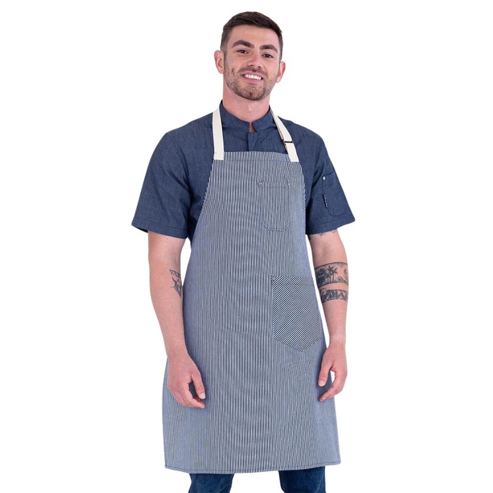 The MIA Bib Apron is a stylish, functional apron crafted from lightweight 100% cotton denim. Designed with cross-back straps, this shorter, above-the-knee apron offers comfort and flexibility, ideal for those on the go.