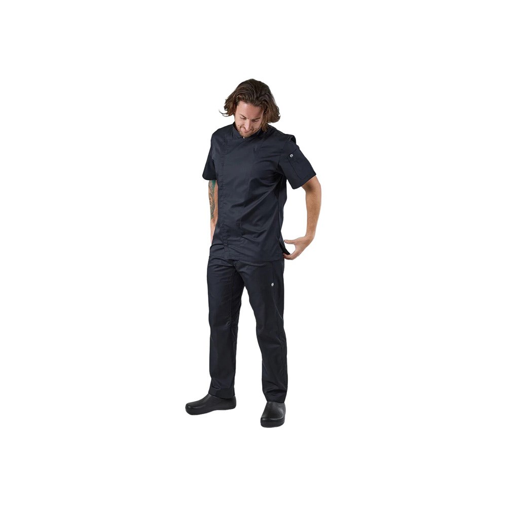 Refine your professional wardrobe with the Cannes Press Stud Chef Jacket in Black (2XL) by Chef Works. Blending contemporary flair with practical design, this unisex jacket features a single-breasted, short-sleeve cut and a discreet concealed snap front for quick changes and a sleek silhouette. Crafted from a breathable poly-cotton blend, it manages moisture while resisting stains, so you stay cool and composed from service start to finish. It has strategic back vents that enhance airflow, and the reinforced shoulder panels provide durability where you need it most. Two front welt pockets accommodate pens, thermometers or order pads, ensuring your essentials are always within reach.