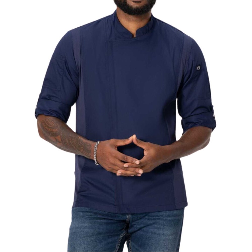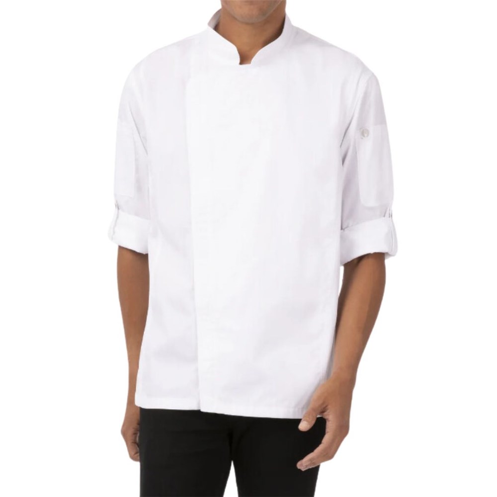 This jacket includes roll-up long sleeves with tabs, a back-collar apron holder with a snap tab, and a left sleeve thermometer pocket for practicality. The single-breasted zipper closure adds a sleek, modern touch. Available in a range of sizes, it's the perfect choice for chefs seeking comfort and sophistication.