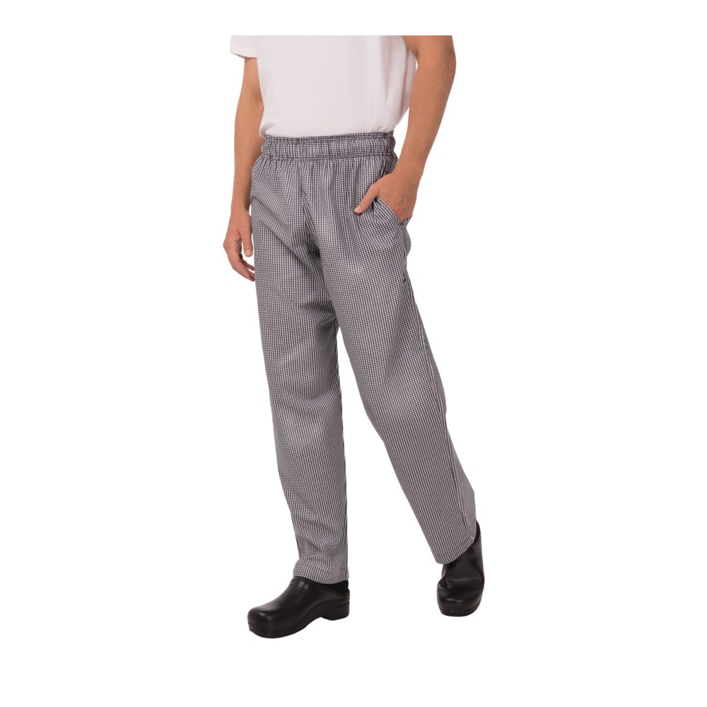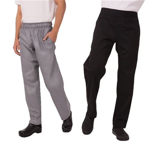 These chef pants available in black or small check check features tapered legs, an elastic waistband and drawstring. See product 5484129 for the small check variant.