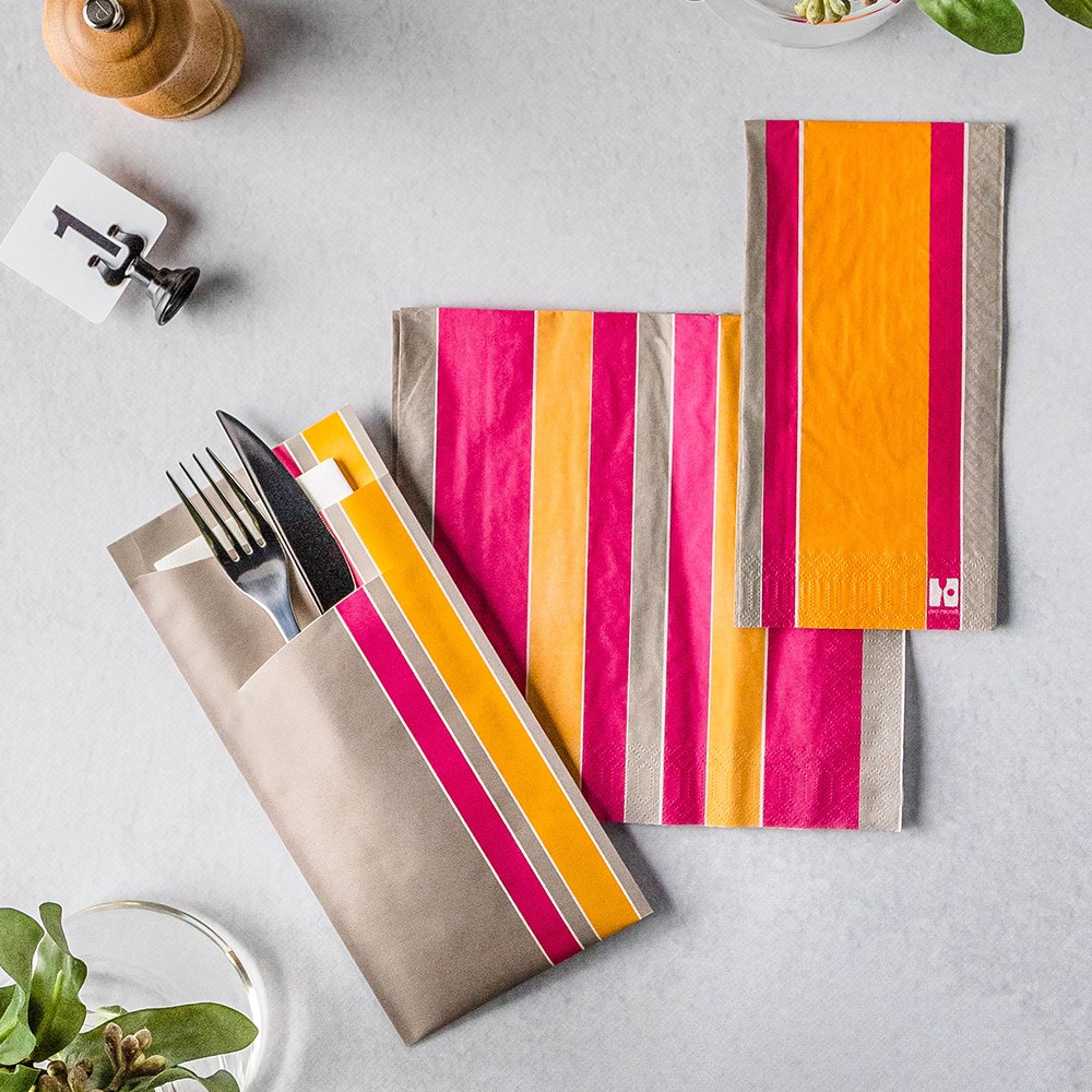 Our chic appearance linen cutlery pouch and napkin by Pro.mundi are an economical solution to cutlery presentation for your tabletop. This classic look cutlery pouch and napkin are great value, however, they don't compromise quality. It features two openings, one to slide the cutlery, and one includes a 3.2L x 4cmW napkin.