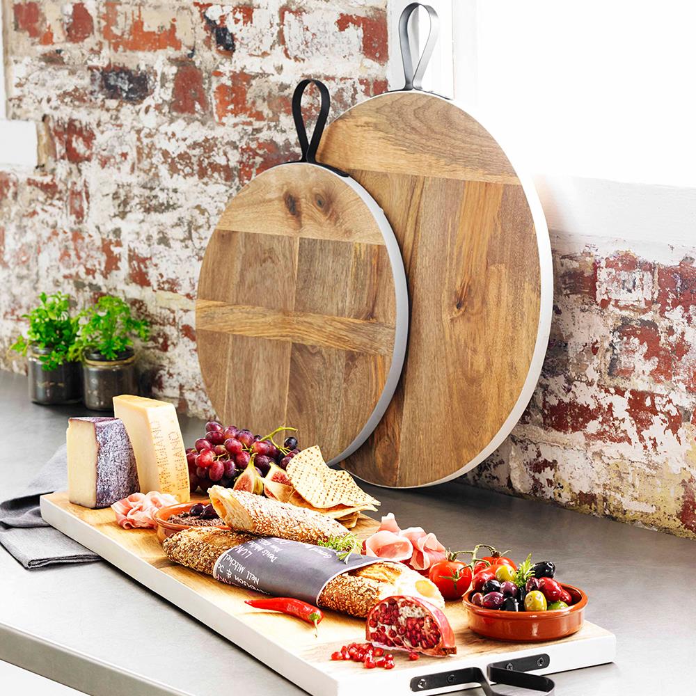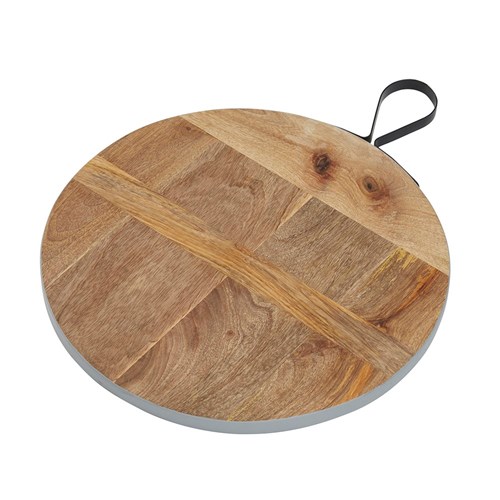 Available in both rectangle and round sizes, this board is perfect for use as a decorative serving platter for a variety of delicious nibbles when entertaining. Board boasts a stunning industrial style. Features a black iron handle for display or storage.